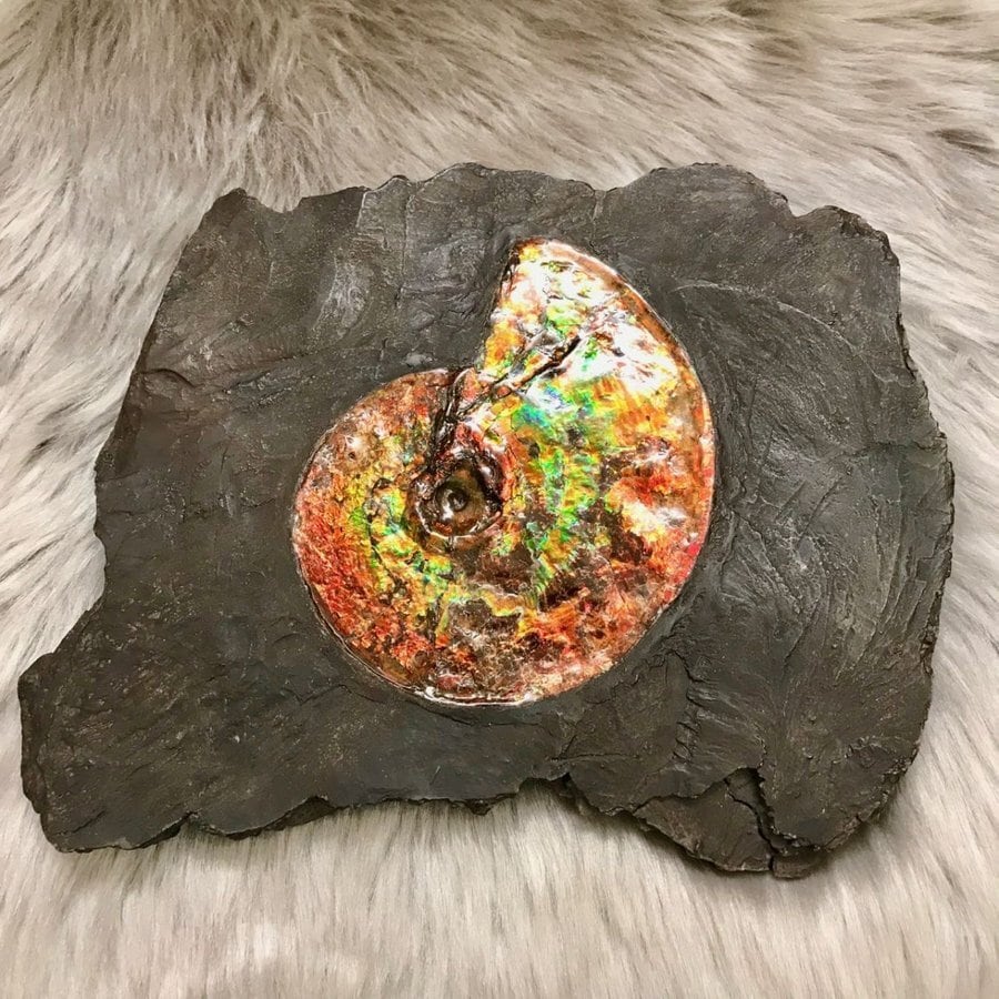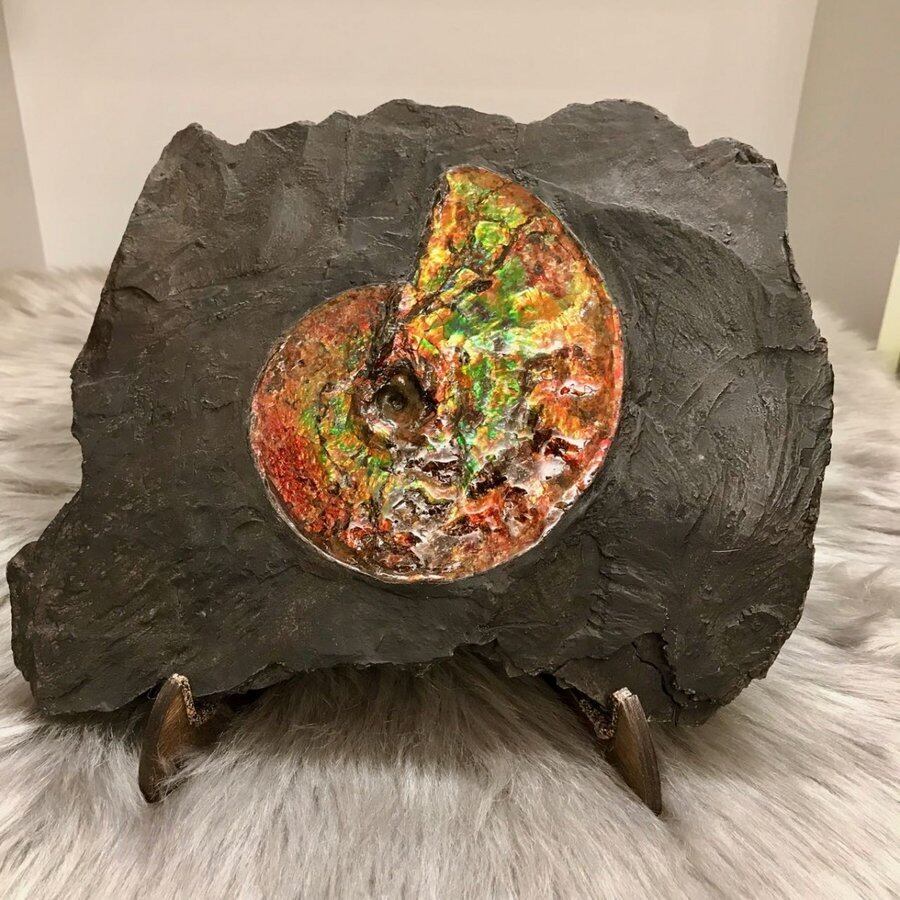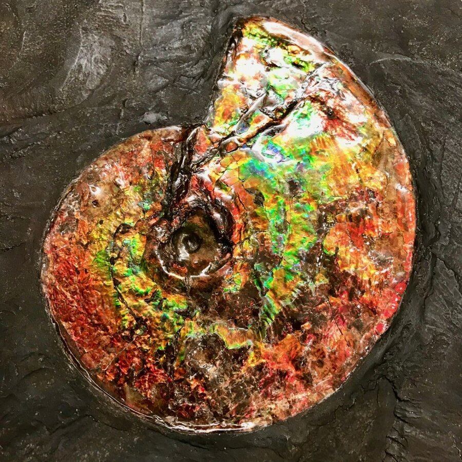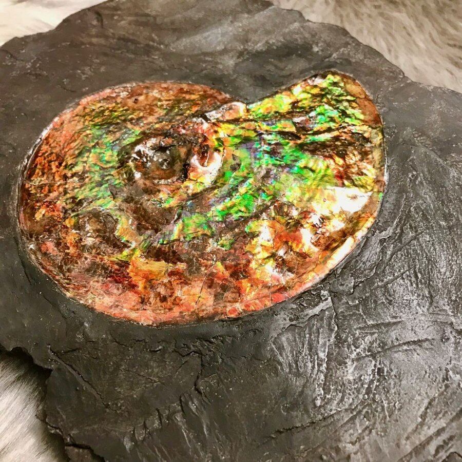 ■特徴:岩に嵌まっているアンモライト。7千万年の年月を経て、地殻変動を繰り返し出来上がった眩しいほどの輝き。圧力がかかればかかるほど色は鮮やかになりますが、形が崩れます。この原石は薄くて取り外せないため、鉱山の岩盤に嵌ったままの状態で仕上げています。
